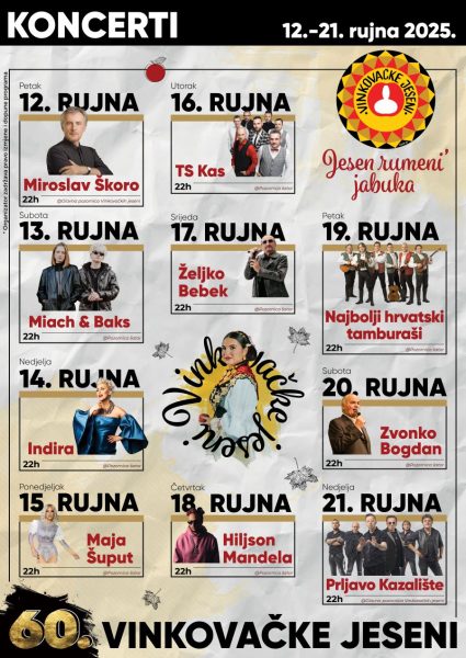 Koncertni dio programa otvara Miroslav Škoro, zatvara ga Prljavo kazalište, a na Jeseni dolaze i legendarni Zvonko Bogdan,  „Najbolji hrvatski tamburaši”, TS „Kas”, Željko Bebek, Indira, Maja Šuput, Miach&Baks i Hiljson Mandela.