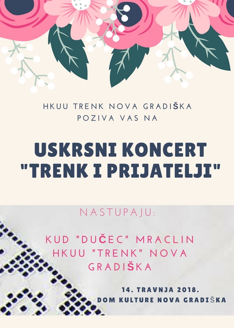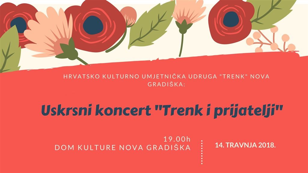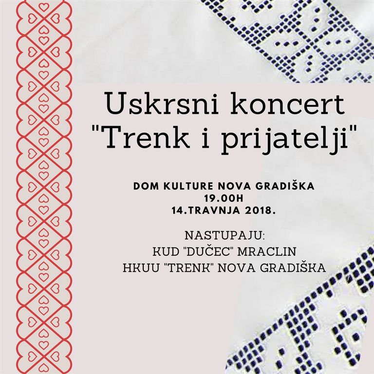 NOVA GRADIŠKA – Hrvatsko kulturno umjetnička udruga “Trenk” Nova Gradiška održat će veliki uskrsni koncert pod nazivom “Trenk i prijatelji”, u subotu 14. travnja 2018. u Domu kulture u Novoj Gradiški, s početkom u 19.00 sati.
