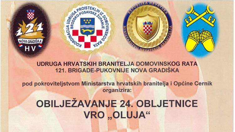 NOVA GRADIŠKA, 30. srpanj 2019. – Koordinacija udruga proisteklih iz Domovinskog rata Brodsko-posavske županije, pod pokroviteljstvom Ministarstva hrvatskih branitelja i Općine Cernik, organizira obilježavanje 24. obljetnice VRO „Oluja“. Nositelj organizacije je Udruga hrvatskih branitelja Domovinskog rata 121. brigade-pukovnije Nova Gradiška.