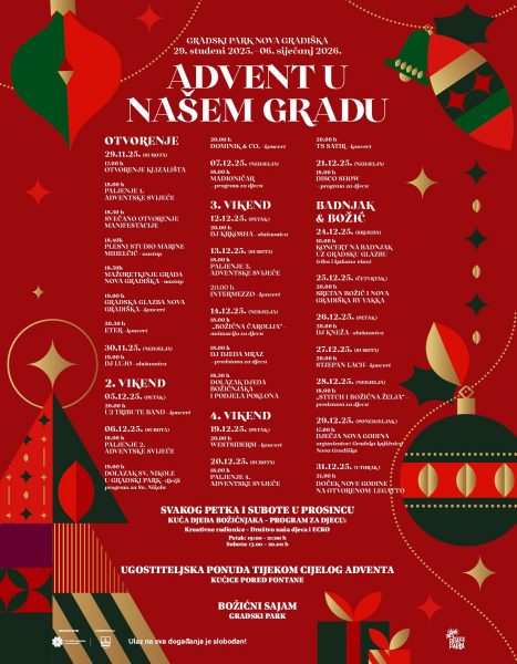 Gradski park u Novoj Gradiški od 29. studenoga 2025. do 6. siječnja 2026. ponovno će zasjati u blagdanskom ruhu i pretvoriti se u središte božićne čarolije. Manifestacija „Advent u našem gradu“ donosi bogat i raznovrstan program koji će i ove godine privući posjetitelje svih generacija.