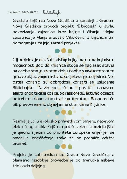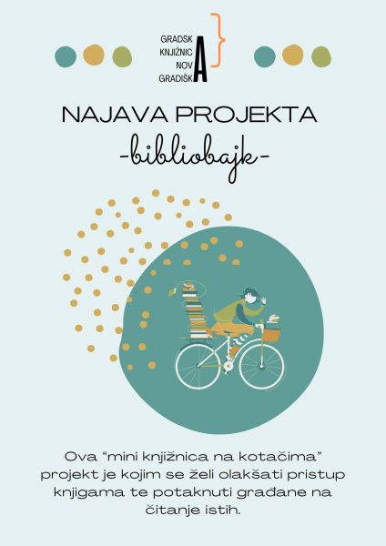NOVA GRADIŠKA,  29.  listopada 2023. –  Gradska Knjižnica Nova Gradiška  pokreće projekt BIBLIOBAJK,  jedinstven projekt „mini knjižnice na kotačima“. Radi se o projektu koji je osmislila Marija Bradašić-Mikolčević, a kako da naslutiti naziv projekta radi se o  dostave knjiga  čitateljima  na kotačima  bicikla, u ovom slučaju   električnim triciklom.  Bit će to usluga čitateljima  starije životne dobi, ali i  svima onima koji  iz zdravstvenih i drugih razloga nisu u mogućnosti doći po knjigu  u knjižnicu.