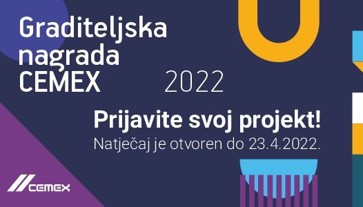 Natječaj za Graditeljsku nagradu CEMEX ove će godine biti otvoren do 23. travnja. Nagrade se dodjeljuju u četiri glavne kategorije — Stambene građevine, Javne i poslovne građevine, Infrastrukturne građevine i Zajednički prostori. Posebne nagrade dodjeljuju se i projektima koji poštuju načela održive gradnje, dostupnosti objekata osobama s posebnim potrebama, ostvaruju posebnu društvenu vrijednost ili pokazuju inovativnost gradnje, u čak četiri kategorije: Održiva gradnja, Inovacije u graditeljstvu, Univerzalna pristupačnost i Društvena vrijednost.