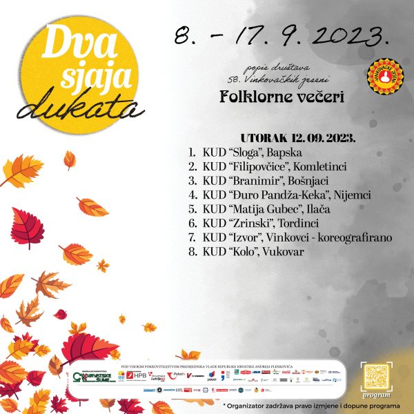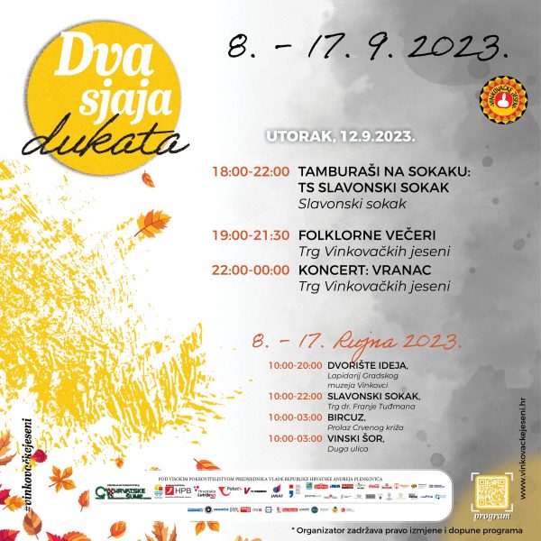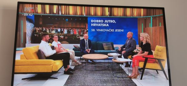 Hrvatska televizija i ove godine poslat će sliku u svijet izravnim prijenosom Svečanosti otvorenja u petak 15. rujna na 1. programu od 20:05 dok uključenje u početak nedjeljnog Svečanog mimohoda, kao i svake godine počinje nakon što na središnjoj vinkovačkoj crkvi sv. Euzebija i Poliona, zvona otkucaju 10:00 sati. Tim povodom, Vinkovačke jeseni u emisiji Dobro jutro, Hrvatska najavili su u studiju već tradicionalno gradonačelnik Vinkovaca i predsjednik Organizacijskog odbora Ivan Bosančić, direktorica Turističke zajednice Martina Matković i Marko Sabljaković, redatelj i autor scenarija ovogodišnjeg otvorenja čiju temu „Dva sjaja dukata” uživamo u punom smislu ovih dana. Stigli smo do polovine manifestacije, kad prije! Večeras je na programu pretposljednja Folklorna večer, a pod budnim okom stručnog ocjenjivačkog suda nastupaju: