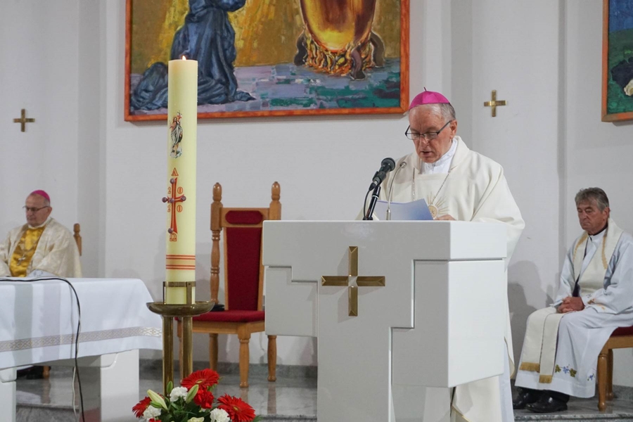 Potom se biskup osvrnuo na naviješteno liturgijsko čitanje iz Djela Apostolskih: »Navedenoj Isusovoj tvrdnji, današnje prvo čitanje iz Djela Apostolskih daje još jednu dimenziju. Naime, sv. Luka nam predstavlja Židova imenom Savao, koji se hranio propadljivim kruhom mržnje i sve svoje snage upotrijebio za progon i ubijanje onih koje je smatrao svojim neprijateljima. Uložio je život u besmisao. Njegovo sljepilo srca svladalo je svjetlo koje ga je oborilo na putu u Damask u namjeri da uhvati protivnike i pobije. To svjetlo bio je sam Isus Krist, u kojem je prepoznao svoje dostojanstvo, izliječio se od sljepila mržnje i postao gorljivi Isusov učenik imenom Pavao. On se sav dao na naviještanje Isusa Krista raspetog, kruha za život svijeta, pomažući ljudima da u njemu pronađu slobodu od sljepila zla, od zarobljenosti propadljivošću. U nedavnoj prošlosti mržnja je na ovim našim prostorima bila propadljiva hrana, sljepilo mnogih srdaca, spremnih na progon i ubijanje drugih kao vlastitih protivnika. Samo oni koji su se hranili nepropadljivom hranom nesebičnosti, spremnom na različite načine za druge umirati donijeli su slobodu i dostojanstvo svima. Želimo danas povjeriti Isusu Kristu našu usrdnu molitvu da nam kao Pavlu pomogne odreći se otrova sebičnosti i mržnje kao hrane srca, te ohrabreni zakonitošću pšeničnog zrna i kruha, živimo položenost života kao stil naših međusobnih odnosa u obitelji, u društvu, među pripadnicima različitih naroda i religija. U tom se krije tajna naše konačne pobjede.«