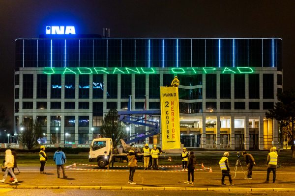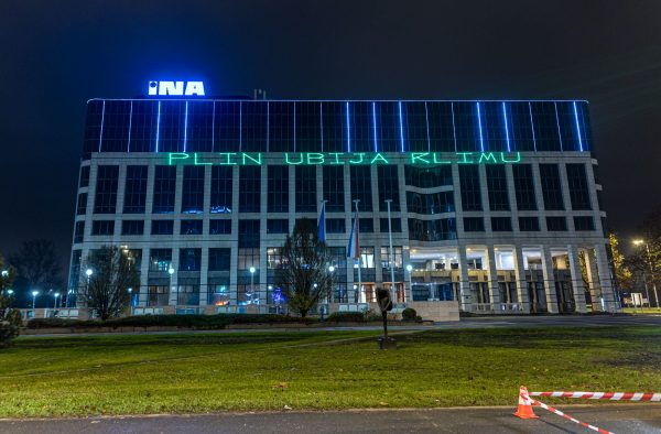 Zagreb, 5. prosinca 2022. – Rano jutros aktivisti Greenpeacea projicirali su svjetlosne poruke na zgradu INA-e u Zagrebu povodom dvogodišnjice potonuća plinske platforme Ivana D u vodama sjevernog Jadrana. “Ivana D – 2 godine nebrige”, “Plinašima profit, Jadranu otpad”, “INA i Vlado RH, što se čeka?”, “Počistite za sobom!” neke su od poruka koje je Greenpeace odaslao INA-i i Vladi.