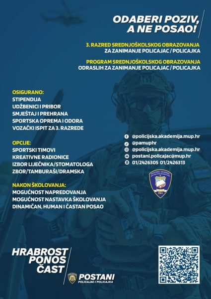 Ministarstvo unutarnjih poslova objavilo je natječaje za upis u Program srednjoškolskog obrazovanja odraslih te za upis učenika u III. razred Policijske škole „Josip Jović“