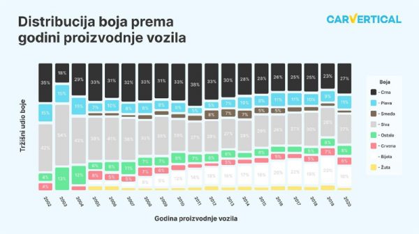 Udio crnih automobila između 2002. i 2020. godine ostao je više-manje isti. Ponekad trendovi boja traju samo nekoliko godina. Na primjer, broj smeđih automobila porastao je između 2012. i 2014. godine, ali je zatim počeo padati u nadolazećim godinama.