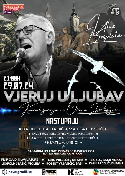 U ponedjeljak, 29. 7. od 21:00 sati ne propustite koncert Vjeruj u ljubav u čast velikana hrvatske glazbene scene, Olivera Dragojevića, na kojem nastupaju Matej Predojević Petrić i Matija Višić, te nagrađeni polaznici pjevačkog Masterclassa; Gabrijela Babić, Matea Lovrić i Matej Mudrovčić Mudri.