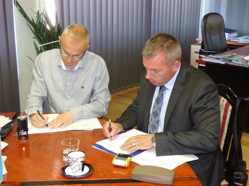 Gradonačelnik Vinko Grgić i Mario Petek predstavnik Zajednice ponuditelja MIPEK d.o.o. iz Križa i tvrtke Elektocentar Petek d.o.o. Ivanić Grad potpisali su ugovor o gradnji