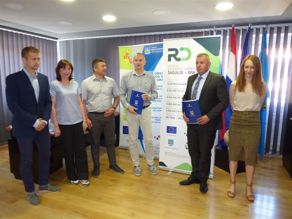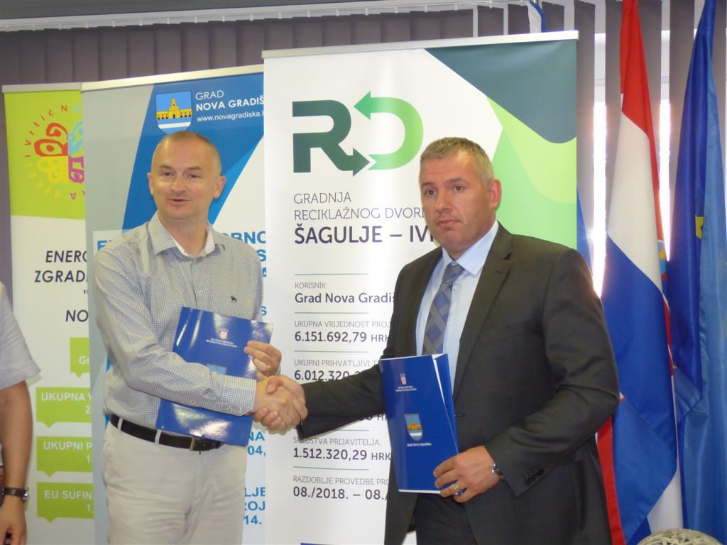 NOVA GRADIŠKA, 14. lipnja 2019. – Danas je u uredu gradonačelnika predstavljen projekt gradnje reciklažnog dvorišta „Šagulje-Ivik“, a gradonačelnik Vinko Grgić i Mario Petek predstavnik Zajednice ponuditelja MIPEK d.o.o. iz Križa i tvrtke Elektocentar Petek d.o.o. Ivanić Grad potpisali su ugovor o gradnji.