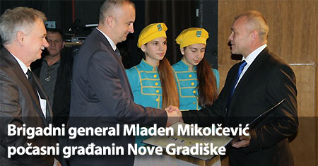 Grad Nova Gradiška u prigodi Dana grada dodjeljuje POVELJU POČASNOG GRAĐANINA GRADA NOVE GRADIŠKE brigadnom generalu MLADENU MIKOLČEVIĆU, za izniman doprinos u stvaranju i očuvanju samostalne Republike Hrvatske.