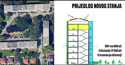 Rad predlaže renovaciju višestambenih peterokatnih zgrada građenih šezdesetih godina prošlog stoljeća dogradnjom šeste etaže, ugradnjom vanjskih dizala i energetskom obnovom.