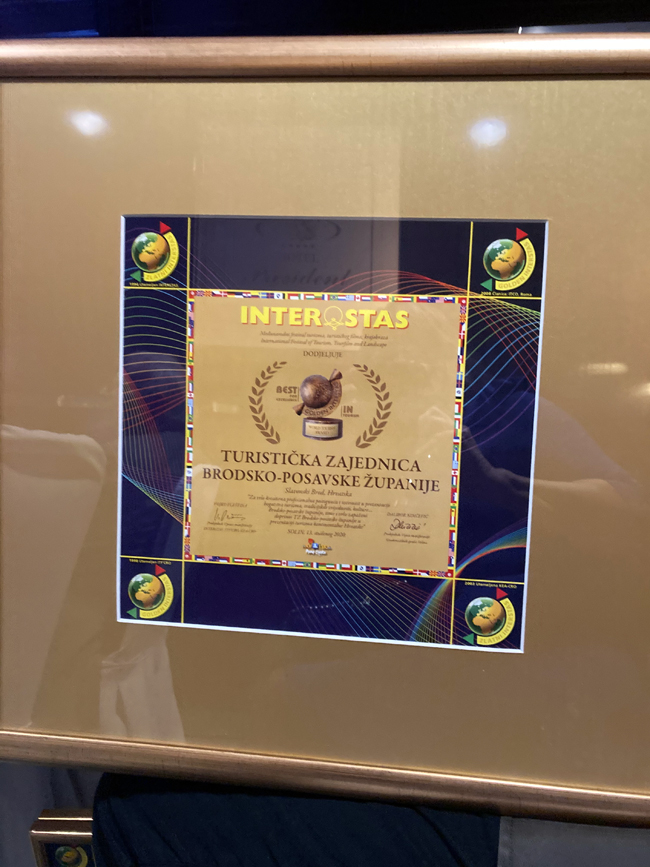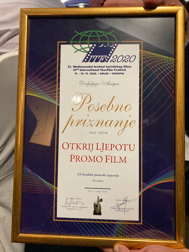 Također je TZ Brodsko – posavske županije osvojila nagradu za promo film „Otkrij ljepotu“ na ZAGREB TOURFILM FESTIVAL 2021 U KATEGORIJI „Turistička destinacija“ čija se promocija održana putem online konferencije krajem listopada.
