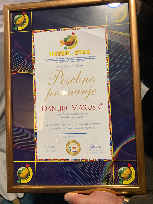 Posebno priznanje Zlatni Interstas , najbolji promo film snimila je ekipa Turističke zajednice Brodsko posavske županije čiji je autor Boris Šeper, direktor tvrtke FILM 54 d.o.o.iz Osijeka.