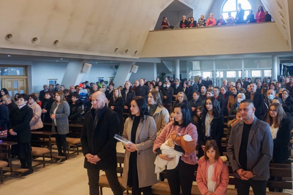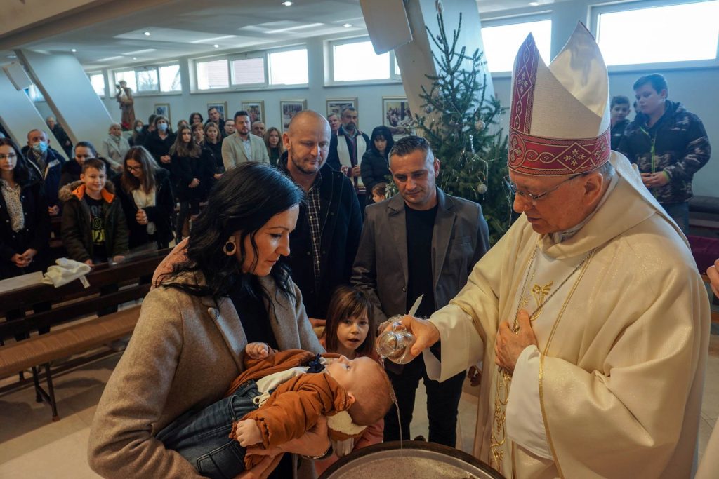 NOVA GRADIŠKA – Na drugu nedjelju po Božiću, 2. siječnja 2022. požeški biskup Antun Škvorčević pohodio je Župu Kraljice Svete Krunice u Novoj Gradiški, predvodio u župnoj crkvi euharistijsko slavlje i krstio Jakova, peto dijete roditelja Karla i Marine Rajh. Župnik Mario Matijević pozdravio je biskupa Antuna i u ime župne zajednice izrazio mu dobrodošlicu. Biskup je okupljenim vjernicima čestitao Božić i zaželio blagoslovljenu Novu godinu. Posebnu čestitku uputio je roditeljima Rajh, koji su donijeli svoje peto dijete na krštenje, zahvalivši im na ponovnom opredjeljenju za život. Kazao je da će ono u svetom krštenju biti povjereno Isusu Kristu, koji je je postao jednim od nas da bi položio sebe za nas na križu i obdario svojom uskrsnom pobjedom.