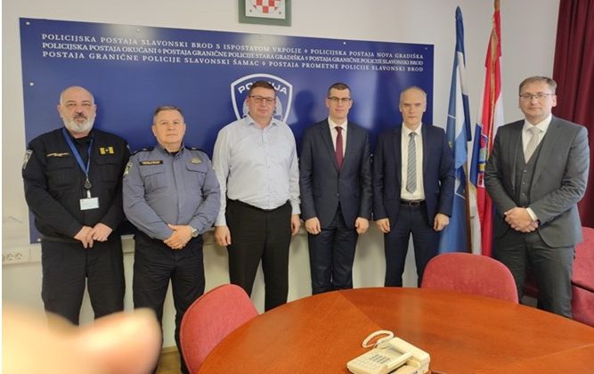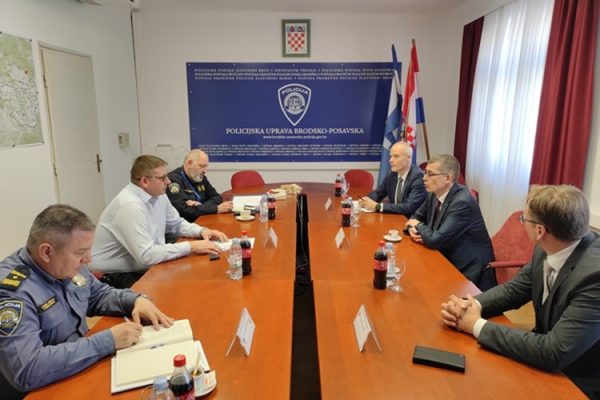 SLAVONSKI BROD, 17, ožujka 2023. – Načelnik Policijske uprave brodsko-posavske Antun Valić sa suradnicima (Dragan Babović pomoćnik načelnika Uprave za granicu Ravnateljstva policije, Ivica Kovačević zamjenik načelnika policijske uprave), danas je u prostorije policijske uprave primio Nj.E. g. Gašpera Dovžana izvanrednog i opunomoćenog veleposlanika Republike Slovenije u Zagrebu sa suradnicima (Srečko Jarc policijski časnik za vezu Republike Slovenije pri RH i Dušan Pšeničnik ekonomski savjetnik Republike Slovenije u RH).