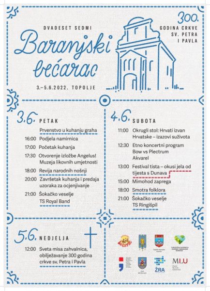 • 17.00 Baranjski bećarac i prvenstvo u kuhanju graha, Crkva sv. Petra i Pavla, Topolje