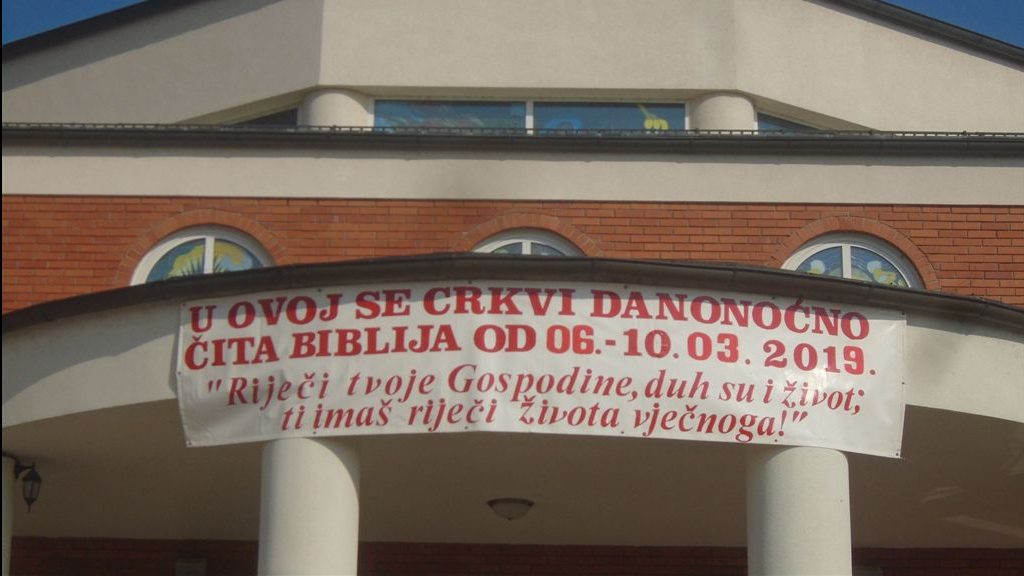 Na ulazu u crkvu poodavno je postavljen transparent na kome piše: „U OVOJ SE CRKVI DANONOĆNO ČITA BIBLIJA OD 06. – 10. 03. 2019.“