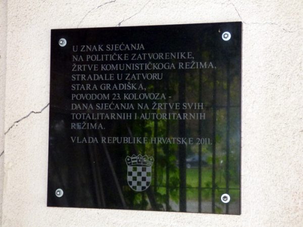 Vlada RH   je u povodu obilježavanja 23. kolovoza Europskog dana sjećanja na žrtve svih totalitarnih i autoritarnih režima  na ulazu u zatvor postavila  spomen ploču u znak sjećanja na političke zatvorenike žrtve komunističkog režima i žrtve svih totalitarnih i autoritarnih režima stradalih u tom zatvoru.