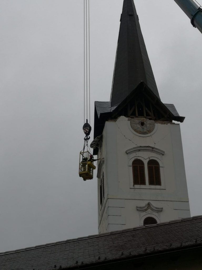 - Započeli smo uklanjanje tornja sa zvonika katedrale u Sisku. Skidanje se radi u fazama. Prva faza je uklanjanje ostataka žbuke i cigle te osiguranje gurtnama zidanog zvonika od urušavanja. Druga faza je skidanje križa sa tornja i treća faza osiguranje samog tornja i skidanje istog u cijelosti. Skidanje tornja vrši se na sličan način kao i na Zagrebačkoj katedrali. Danas se planira izvršiti treća faza uklanjanja cijelog tornja, i nakon toga uklanjanje zvona iz zvonika. Radove izvode djelatnici JVP grada Zagreba, specijalistički tim za spašavanje iz dubina i s visina. Spašavanje iz ruševina odrađuje se u suradnji sa JVP Grada Siska, poduzećem Mamut Zagreb, PU Sisačko-moslavačka i djelatnika župe – rekao je zapovjednik Javne vatrogasne postrojbe Grada Zagreba Siniša Jembrih.