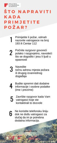 U slučaju da primijetite požar, odmah nazovite vatrogasce na broj 193 ili Centar 112, navedite što se dogodilo i jesu li ljudi u opasnosti te navedite točnu adresu gdje ste primijetili požar.