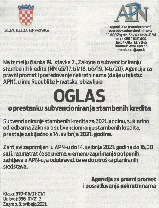 ZAGREB – Šesti po redu poziv za subvencionirane kredite za mlade obitelji bliži se kraju. Petak, 14. svibnja 2021., posljednji je dan za predaju dokumentacije za subvenciju kredita za kupnju kuće ili stana ili gradnju kuće. Posljednji službeni podaci APN-a govore da je od 29. ožujka do 6. svibnja 2021. godine zaprimljeno 3.798 zahtjeva što pokazuje i dalje velik interes građana za ovu mjeru.