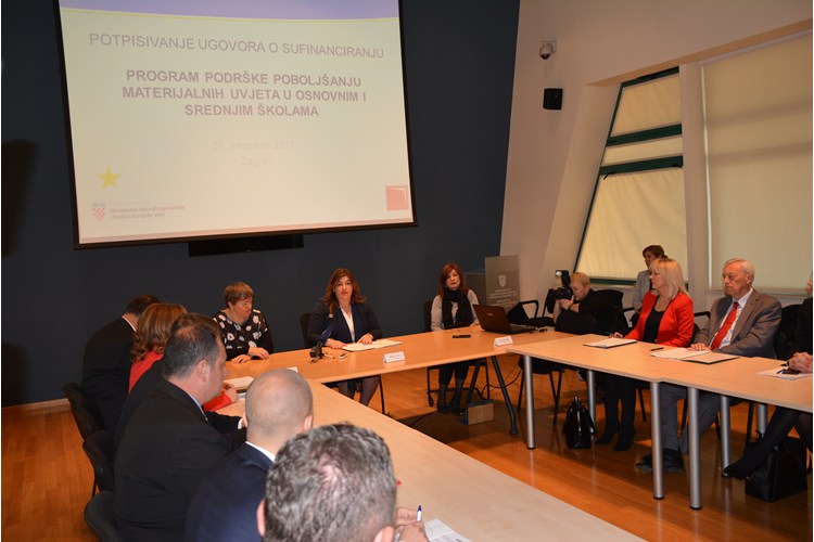 ZAGREB – U utorak, 31. listopada 2017. godine, u prostorijama Ministarstva regionalnoga razvoja i fondova Europske unije, potpisani su ugovori o sufinanciranju po Programu podrške poboljšanju materijalnih uvjeta u osnovnim i srednjim školama kojima je dodijeljeno ukupno 42 milijuna kuna za poboljšanje materijalnih uvjeta u 47 objekata osnovnih i srednjih škola diljem Hrvatske.