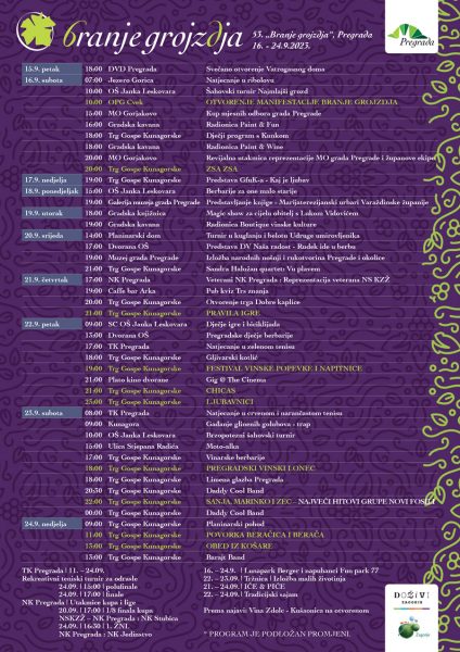 Posljednjeg tjedna u rujnu u gradu Pregradi tradicionalno se održava manifestacija „Branje grojzdja“, posvećena grožđu i njegovoj preradi, kojoj je osnovna namjera njegovati tradicionalne običaje Hrvatskog zagorja vezane uz berbu i preradu grožđa te prikazati tradicijsku kulturu našeg kraja. Svaku godinu manifestacija je popraćena bogatim eno-gastro, kulturnim, dječjim, sportskim i zabavnim sadržajem te ima visoku posjećenost. Ove godine manifestacija bilježi svoju 53. obljetnicu, trajat će od 16. do 24. rujna 2023., a kroz devet dana ponudit će različita događanja među kojima će svatko pronaći nešto za sebe.