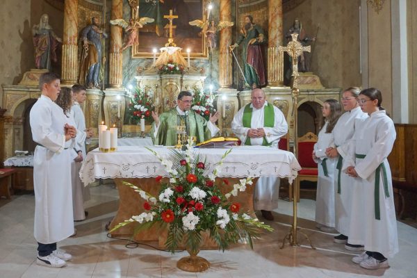Na početku svete mise župnik Ivan Nikolić uputio je biskupu Ivi pozdravne riječi dobrodošlice, a predstavnici vjernika predali su mu prigodni dar. Zahvaljujući na riječima dobrodošlice biskup je pozdravio sudionike slavlja, napose roditelje Bilešić. Kazao je kako su oni prihvatili Dinu kao Božji dar. „Peto dijete u vašoj obitelji je peti veliki blagoslov, po daru života koji Bog daje. Bog je izvor života i radosti kako nas na to podsjeća i ulazna pjesma na početku ovog misnog slavlja. Po životu Bog unosi u naše živote radost spasenja i po nama spašava druge ljude, a u to djelo spasenja uključena je i malena Dina“, rekao je biskup. Istaknuo je kako se zajedno s roditeljima novom životu raduje cijela župna zajednica te je pozvao nazočne da se po njezinu krštenju i oni obnove u svijesti da ih je Bog svojom milošću ispunio, uzljubio i ne prestaje ih ljubiti što se na poseban način ostvaruje i po ovoj gozbi njegove ljubavi. Pozivajući ih na sabrano sudjelovanje kazao je kako ih euharistijsko slavlje učvršćuje u ljubavi prema Bogu i međusobnoj ljubavi.