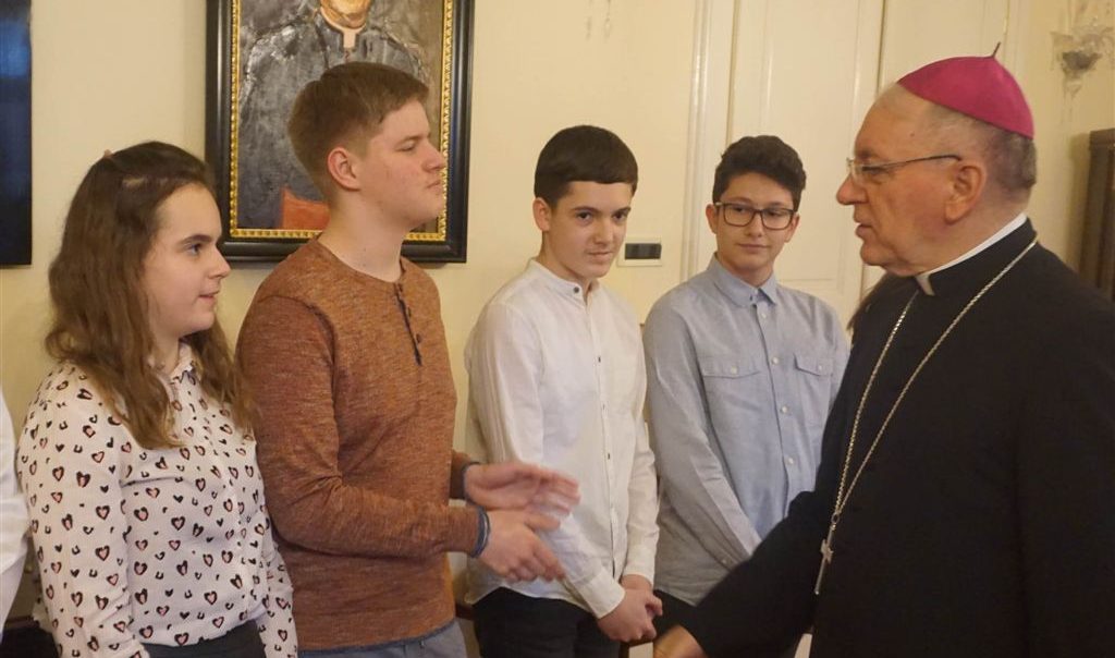 POŽEGA, 20. studenoga 2020. – Pobjednici ovogodišnje državne Vjeronaučne olimpijade u kategoriji osnovnih škola su vjeroučenici iz Osnovne škole Mate Lovraka u Novoj Gradiški: Mihael Božić, Edi Conjar, Ella Conjar i Domagoj Ivanišević na čelu s mentoricom vjeroučiteljicom Andrijanom Petrović. Prigodom ostvarenog uspjeha biskup Antun je svakom pojedinom učeniku uputio čestitku u kojoj kaže: