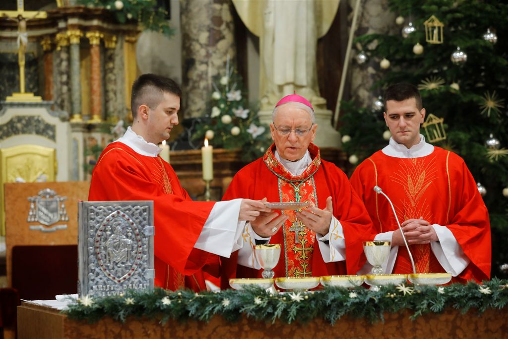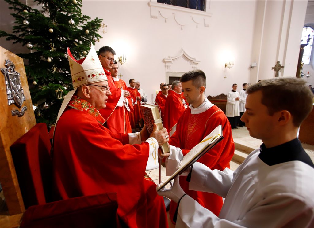 POŽEGA, 27. prosinca 2019. – Na drugi dan Božića, blagdan sv. Stjepana, 26. prosinca biskup Antun Škvorčević predvodio je euharistijsko slavlje u požeškoj Katedrali tijekom kojeg je Marka Milakovića iz Župe sv. Barbare u Jakšiću zaredio za đakona. Biskup je uputio pozdrav svima nazočnima, napose svećenicima među kojima je bio i rektor Nadbiskupskog bogoslovnog sjemeništa u Zagrebu Anđelko Košćak, ređenikovim roditeljima i vjernicima iz župe Jakšić te samom kandidatu za đakonat. Podsjetio je da danas slavimo blagdan sv. Stjepana Prvomučenika, jednoga iz zbora sedmorice koji su u jeruzalemskoj Crkvi bili izabrani za djelo služenja. Kazao je da se i kandidat za đakonat na svoj način pridružuje tom istom djelu te je pozvao nazočne da otvore prostore vjerničkog srca i postanu dionicima događaja koji je Bog ostvario u đakonu Stjepanu i pokrenuo u ređeniku Marku.