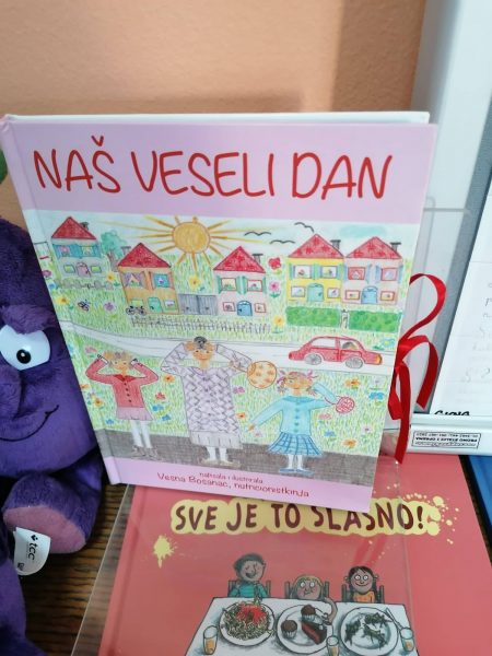 „ Slikovnica NAŠ VESELI DAN namijenjena je svim veselim, razigranim i nestašnim djevojčicama dobi od 3 do 7 godina koje vole crtati, igrati se, biti vani, ići u kupovinu hrane, pomagati majkama i bakama u kuhinji, a nadasve uređivati se. Ova slikovnica podučava djecu brojevima, slovima, geometrijskim likovima, vezivanju vezica, što je lijevo, a što desno te nenametljivo priča o raznolikoj prehrani. Njezin interaktivni dio, kroz crtanje, potiče male čitatelje na samostalno osmišljavanje kvalitetnih obroka što je temelj pravovremenog usvajanja dobrih prehrambenih navika za cijeli život.“ Autorica je s veseljem napisala posvetu GKNG i djeci i roditeljima, budućim čitateljima.