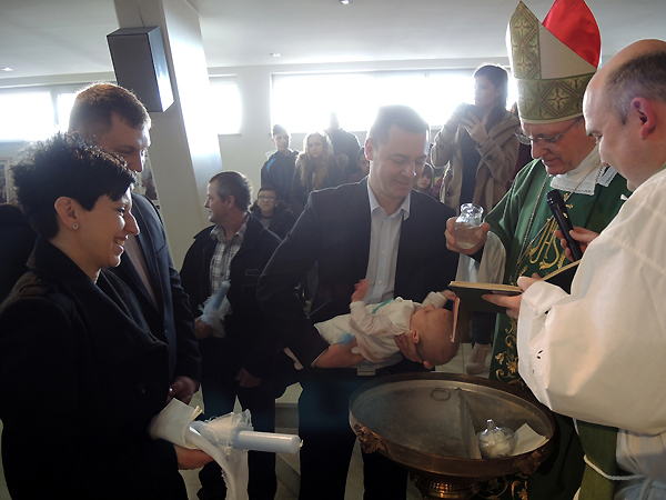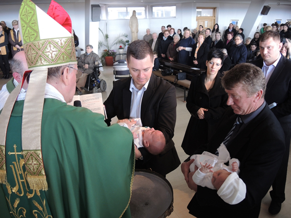 NOVA GRADIŠKA – Požeški biskup Antun Škvorčević pohodio je na Dan života, u nedjelju, 5. veljače župu Kraljice Svete Krunice u Novoj Gradiški i u župnoj crkvi predvodio euharistijsko slavlje tijekom kojega je krstio Rafaela, peto dijete Ive i Andreje Banović, te Frana, treće dijete Tomislava i Martine Janković. Na početku misnog slavlja biskupa Antuna je pozdravio župnik Ivan Štivičić. Zahvalivši na riječima dobrodošlice biskup je rekao kako mu je posebno drago da na Dan života može biit u Novoj Gradiški na ovako znakovitom slavlju. Istaknuo je da je »rođenje novog života najveći, Božji događaj na zemlji« i da zato rado dolazi izraziti zahvalnosti i poštovanje onim roditeljima koji su se još jedanput opredijelili za život. Pozdravio je obitelj Banović i obitelj Janković, koje su donijele djecu na krštenje, rekavši da je »u krštenju sam Isus Krist u krštenicima snagom Duha ostvaruje svoje djelo, zahvaća ih onom ljubavlju koja je pobijedila smrt, ugrađuje ih u svoj živi organizam Crkve i oni postaju njegovi«, a da »mi samo služimo tom Isusovu djelu«. Pozvao je nazočne da otvore »svoja srca za to Božje djelovanje među nama«.