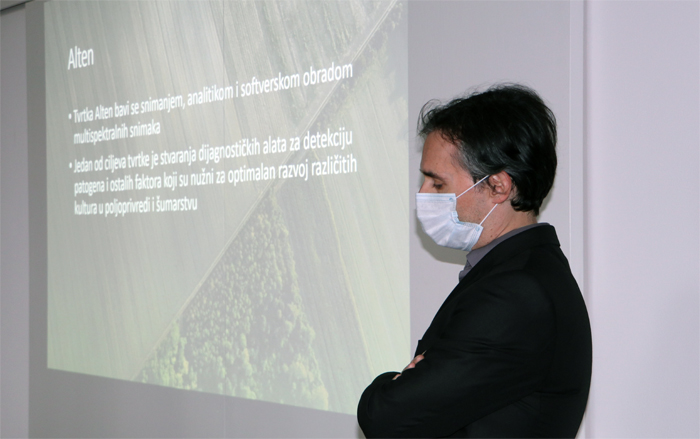 Trenutne mogućnosti u preciznoj poljoprivredi, opremu i analitičke softvere prezentirao je ing. Igor Bionda, također iz tvrtke Alten. Upoznao je sudionike s različitim tipovima dronova, multispektralnih i hiperspektralnih kamera, te kako je kroz snimanje gradijenata temperature, plodnosti, vlage i sličnih indeksa moguće precizno uputiti na abnormalnosti kod različitih biljnih kultura. Također, opisao je i prednosti korištenja ovakvih tehnologija te benefite koje one nude kao što su optimizirana uporaba pesticida, preventivno agrotehničko djelovanje itd.