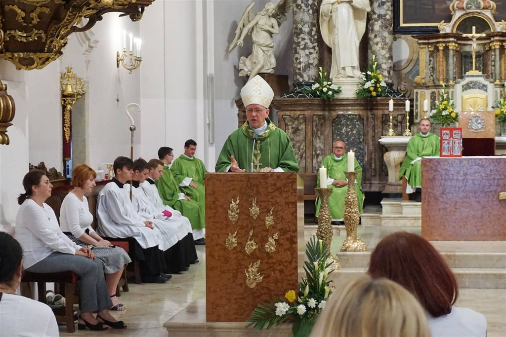 Nakon što se sjedinio s Isusom Kristom u njegovoj molitvi iz današnjeg evanđelja, biskup je sudionicima slavlja čestitao dvadeset i treću obljetnicu utemeljenja Požeške biskupije i imenovanja prvoga požeškog biskupa. »Posebnim osjećajima srca zajedno s vama zahvaljujem Bogu što nam je darovao sv. Ivana Pavla II. te je sveti Papa, pun osjetljivosti „za sve Crkve“ po božanskom naumu utemeljio našu požešku mjesnu Crkvu, uvrstivši je u zajedništvo opće Crkve kojem rimski biskup predsjeda u ljubavi. Zahvaljujem svoj braći svećenicima, među njima najbližim suradnicima u Biskupskom ordinarijatu i Stolnom kaptolu, redovnicima, redovnicama, vjeroučiteljima što su mi uz Božju pomoć koja nije izostala podarili svoje povjerenje i suradničku raspoloživost te sam tijekom 23 godine biskupskoga služenja mogao vršiti svoje poslanje i slabim silama pridonijeti da Isus Krist, isti jučer, danas i uvijeke, može među nam djelovati i ostvarivati kraljevstvo Božje. Posebnu pak zahvalnost želim posvjedočiti brojnim vjernicima koji slijede Isusa krotka i ponizna srca, te u njima odjekuje Božja riječ, koju razumiju, s radošću prihvaćaju i od nje žive, očitujući to na poseban način na hodočašćima u naša Marijina svetišta, gdje poput nje – vjerne službenice Božje – u toj riječi pronalaze istinu vlastitog života i smisao u njezinu vjernom vršenju. Svojom jednostavnošću i malenošću, ali dubokom vjerom, nadom i ljubavlju, kršćanskim životom u braku i obitelji, te u javnom životu oni svjedoče u našim župama kako je Crkva Isusov živi organizam koji se očituje i ostvaruje u našoj Biskupiji«, kazao je biskup.