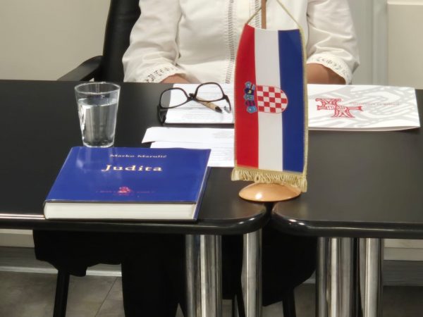 Nakon izlaganja Generalnog konzula prof. dr. sc. Lahorke Plejić Poje je izuzetno stručno, a moguće je reći i dojmljivo održala predavanje o životu i radu Marka Marulića. Posebno te naglasila okružje u kojem je živio, onodobni Split, ugrožen od Osmanlija te izuzetno vješto i logično povezivala njegovu svakodnevicu s djelima kojima je i stekao naziv oca hrvatske književnosti, poglavito „Juditu“. Prof. Poje je na izuzetno zanimljiv način objasnila i interes za čitanje Marka Marulića u Europi 16. i 17. stoljeća.