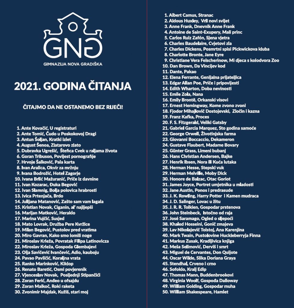 U suradnji profesora hrvatskoga jezika, izradio se popis književnih djela, 50 iz strane književnosti i 30 iz domaće, za koja se smatra da bi svaki čovjek trebao pročitati od djetinjstva do kraja svog života.
