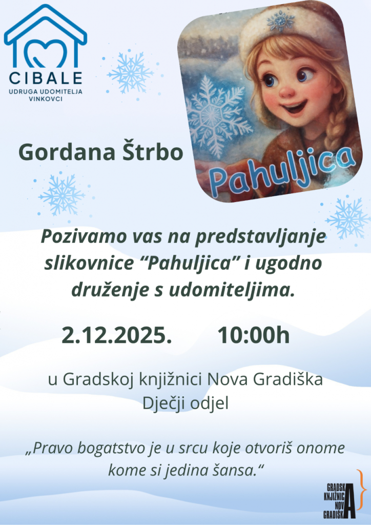 NOVA GRADIŠKA, 28. studenoga 2025. – Marija Bradašić Mikolčević, ravnateljica Gradske knjižnice Nova Gradiška, poziva vas na predstavljanje slikovnice “Pahuljica”, autorice Gordane Štrbo koja će se održati 2. prosinca 2025. godine s početkom u 10 sati na Dječjem odjelu Gradske knjižnice Nova Gradiška. U goste dolaze udomitelji iz Udruge udomitelja Cibale iz Vinkovaca čija je suosnivačica i predsjednica Gordana Štrbo.