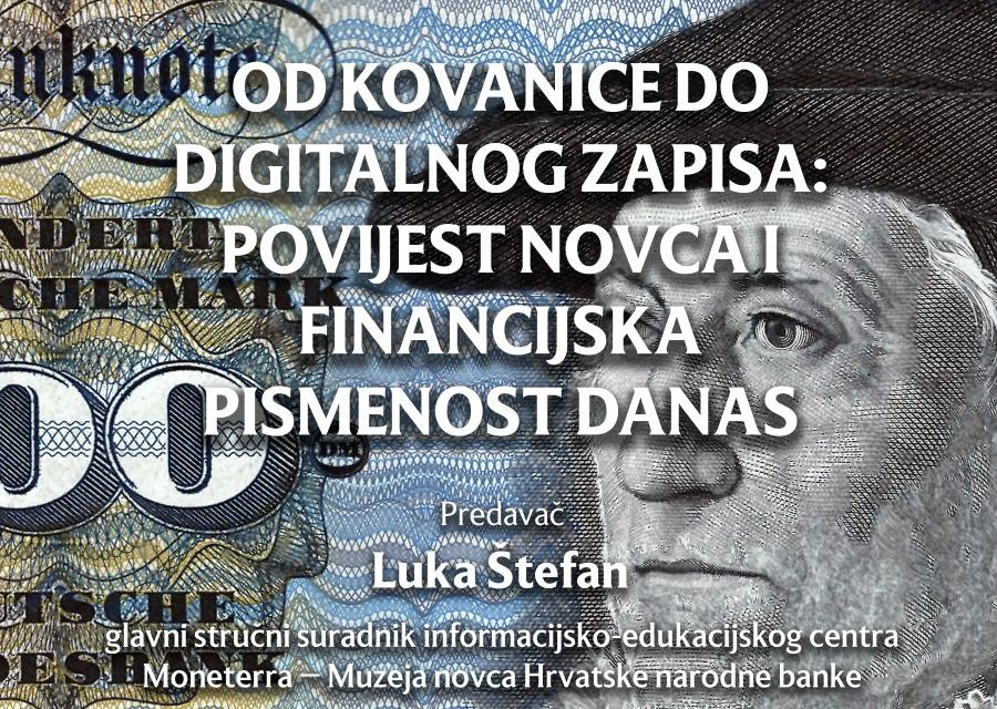 Povodom Svjetskog tjedna novca Gradski muzej u suradnji s Informacijsko-edukacijskim centrom Monetera – Muzej novca Hrvatske narodne banke, u četvrtak 26. ožujka s početkom u 18 sati, organizira predavanje „Od kovanice do digitalnog zapisa: povijest novca i financijska pismenost danas“. Predavanje će održati Luka Štefan, glavni stručni suradnik informacijsko-edukacijskog centra Moneterra – Muzeja novca Hrvatske narodne banke.