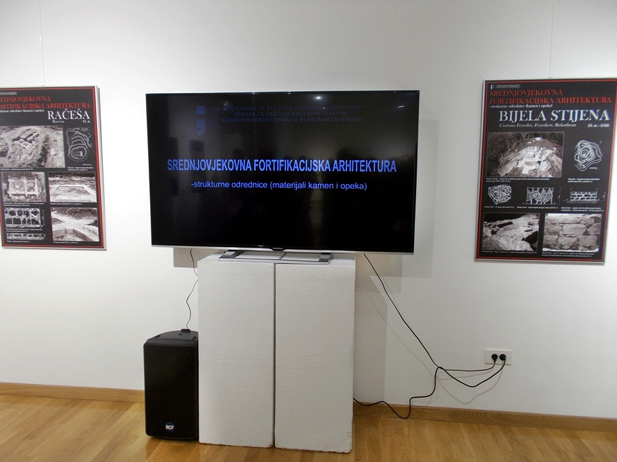 -Srednjovjekovni plemićki gradovi, utvrde, kašteli i drugi fortifikacijski sklopovi, gledajući u cjelini, uslijed niza faktora najugroženija su i najranjivija skupina naše graditeljske baštine. Danas su to većinom ruševni ostatci nekada arhitektonskih i fortifikacijskih cjelina i sklopova koji su građeni na našim prostorima u razdoblju od 13. do 16. stoljeća. Za srednjovjekovnu fortifikacijsku arhitekturu pored morfoloških i tipoloških karakteristika, s kojima određujemo tipove fortifikacija, u odnosu na položaj u prostoru, tlocrtne oblike i stilske karakteristike, jedan od bitnih elemenata za njezinu valorizaciju analiza je materijala, načina zidanja na temelju kojega možemo odrediti dataciju izgradnje i graditeljsku slojevitost. Na ovoj iznimno vrijednoj izložbi upravo ti nalazi prezentirani su na 10-ak srednjovjekovinih utvrda na području Slavonije od Iloka do Okučana (Rašaška ili Račeša, Ružica grad, Velika, Bedemgrad, Šarengrad, Ilok, Bijela Stijena,Viškovci, Kolođvar, Gračanica).