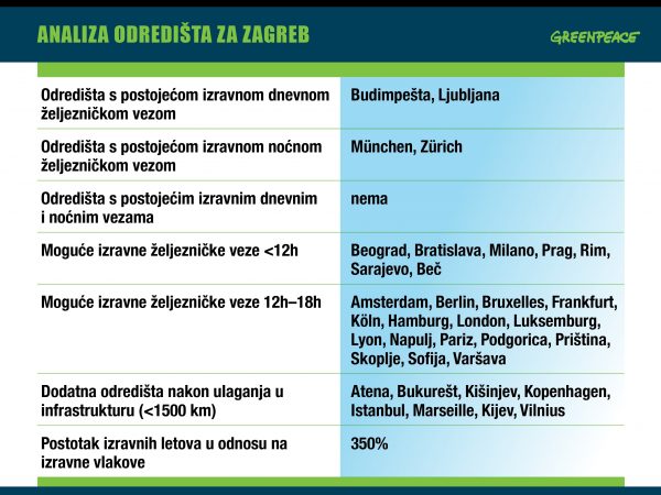 Greenpeace je analizirao 990 ruta između 45 velikih europskih gradova, od čega za samo 12 posto ruta postoji izravna veza vlakom, dok za 69 posto postoji izravan let. Dakle, gotovo je šest puta više izravnih letova nego izravnih željezničkih linija između velikih gradova diljem Europe.