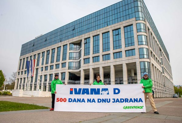 Zagreb, 19. travnja 2022. – Aktivisti Greenpeacea jutros su prosvjedovali ispred zgrade INA-e u Zagrebu i podsjetili na skandaloznu činjenicu da je nakon 500 dana od potonuća plinska platforma Ivana D i dalje na dnu Jadranskog mora. Iskazali su i nezadovoljstvo presporom istragom koju je Ministarstvo gospodarstva i održivog razvoja pokrenulo 18. siječnja 2021., a da u proteklih 15 mjeseci javnost nije saznala ništa novo – kako, zašto i pod kojim uvjetima se dogodila havarija.