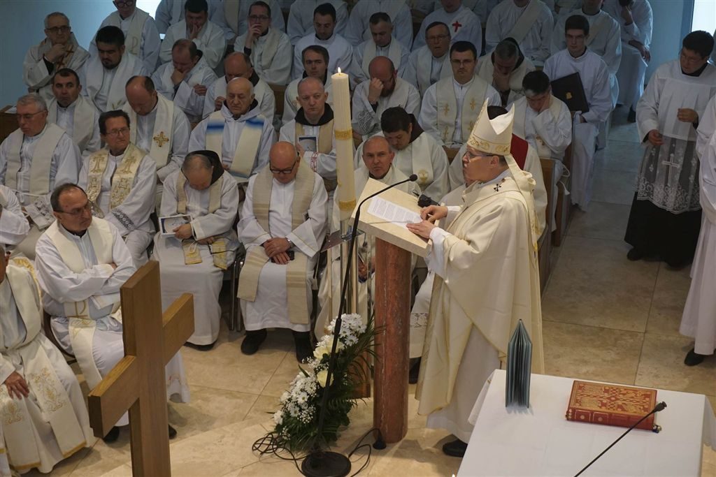 Osvrnuvši se zatim na naviješteni evanđeoski ulomak, nadbiskup Hranić je rekao nazočnima da im Isus danas u ovoj spomen crkvi u Staroj Gradiški poručuje neka ne rade za hranu propadljivu, nego za hranu koja ostaje za život vječni. Još im je kazao da ih Isus poziva da ne ostanu na razini obavljanja službe, očekivanoga, propisanoga, obveznoga, minimuma, nego da se uzdignu na razinu osobnog zajedništva s Kristom Gospodinom iz čega proizlazi i osobno poistovjećenje s njegovim poslanjem. Poručio im je da im Isus želi pomoći da se kao pastiri njegova svetog naroda izdignu iznad pukog zadovoljavanja svojih materijalnih potreba, kako bi mogli činiti djela Božja, i biti vjerni Isusu Kristu. „Djelo je Božje osobni susret s Isusom kao Osobom, s utjelovljenim Sinom Božjim po kojemu i za kojega je sve stvoreno, koji je izvor i uvir cjelokupne stvorene stvarnosti, koji ljubi mene i čitav svijet, koji je iz ljubavi umro za nas, koji je mene osobno i svu moju braću – prezbiterij kojemu pripadam – pozvao i snagom sakramenta svetog reda suobličio sebi“, zaključio je nadbiskup Đuro.