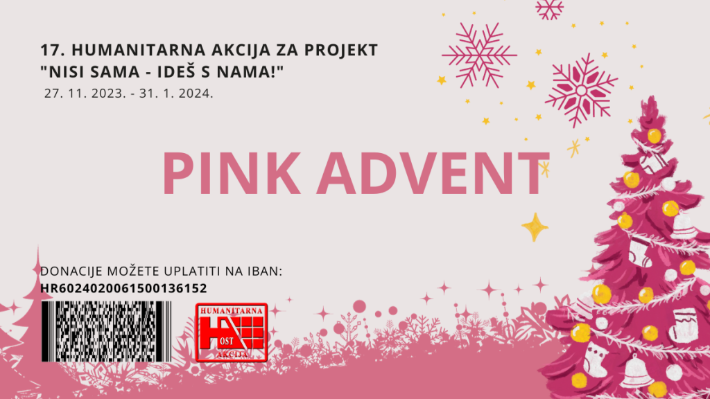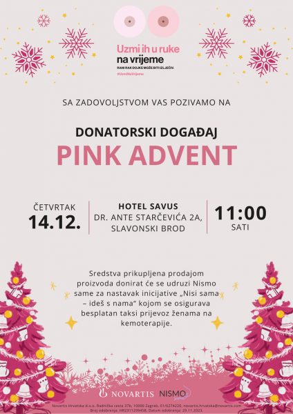 Pozivamo vas da se pridružite donatorskom događaju „Pink Advent“ u četvrtak, 14. prosinca u 11 sati u Hotelu Savus, Dr. Ante Starčevića 2a, Slavonski Brod.