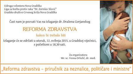 Svi zainteresirani građani koji žele čuti nešto više o prijedlozima dr. Gorjanskog za bolje hrvatsko zdravstvo, pozvani su u utorak 12. svibnja 2015. godine u 18 sati i 30 minuta u novogradišku Gradsku vijećnicu, u kojoj će se održati izlaganje dr. Gorjanskog i predstavljanje njegove knjige „Reforma zdravstva – priručnik za neznalice, političare i ministre“.