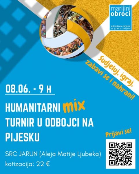 Humanitarna organizacija Marijini obroci organizira turnir u odbojci na pijesku za mješovite trojke, a prihod od kotizacija bit će namijenjen osiguravanju svakodnevnih školskih obroka za djecu u najsiromašnijim krajevima svijeta. Turnir će se održati u nedjelju, 8. lipnja 2025.