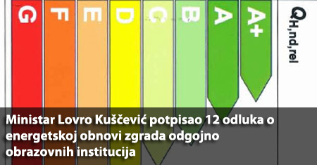 ZAGREB / NOVA GRADIŠKA – Danas, 11. travnja 2016. ministar graditeljstva i prostornog uređenja Lovro Kuščević potpisao je 12 odluka o energetskoj obnovi zgrada odgojno obrazovnih institucija; dva dječja vrtića, sedam osnovnih škola, i tri centra predškolskog odgoja. Odluke se temelje na Pilot projektu „Energetska obnova zgrada i korištenje obnovljivih izvora energije u javnim ustanovama koje obavljaju djelatnost odgoja i obrazovanja“. Ukupna vrijednost investicija iznosi 9 milijuna kuna od čega bespovratna sredstva Europskog i hrvatskog Fonda iznose 7 milijuna kuna.