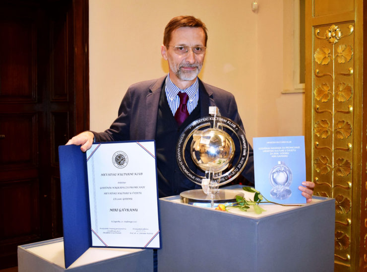 ZAGREB, 28. studenoga 2017. – U Muzeju za umjetnosti i obrt svečano je dodijeljena godišnja Nagrada za promicanje hrvatske kulture u svijetu za 2016.godinu. Žiri za dodjelu Nagrade prof.dr.sc. Slobodan Kaštela, Damir Matković, prof. Želimir Mesarić, Ivan Đerek i dr.Mijo Ivurek jednoglasnom je odlukom odlučio da se Nagrada dodijeli hrvatskom književniku Miri Gavranu.