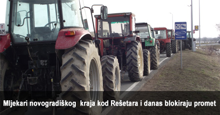 NOVA GRADIŠKA, 26. veljače 2012. – Proizvođači mlijeka i ratari s novogradiškog područja i danas s dvadesetak traktora blokiraju prometnicu koja od Rešetara vodi na autocestu. Prilaz autocesti moguć je iz pravca Požege