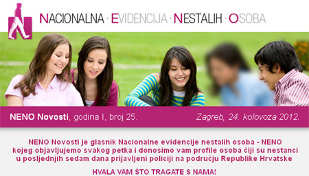 Mjesto i datum nestanka: Trnava, 21. 8. 2012. Opis: Josipa Zilinski (15) visoka je 175 centimetara, ima crnu kosu i smeđe oči, ovalno lice i srednje je tjelesne građe. Josipa se u utorak 21. kolovoza udaljila od kuće. Tada je bila odjevena u kratke crne hlače, zelenu majicu kratkih rukava, a na nogama je imala sandale. Ukoliko ste vidjeli osobu molimo da posjetite njen profil u Nacionalnoj evidenciji nestalih osoba (klikom na sliku) na www.nestali.hr, nazovete broj 192 ili se javite u najbližu policijsku postaju. |